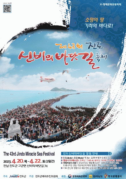 문화체육관광부 선정 K-명예관광축제인 제43회 진도 신비의 바닷길 축제가 20일부터 22일까지 진도군 고군면 회동리 일원에서 열린다.