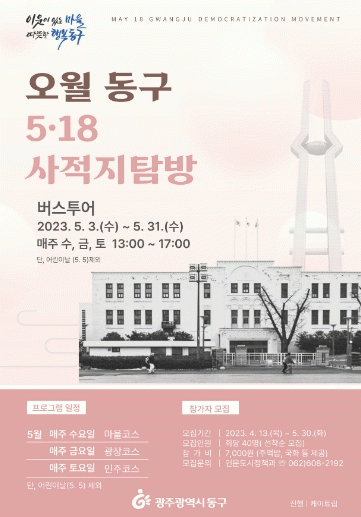 이번 탐방은 관내 5·18 주요 사적지 등을 주 3회(수·금·토) 오후 1시부터 5시까지 ‘마을코스’, ‘광장코스’, ‘민주코스’ 등 3개 코스로 구성해 해설사와 함께 하는 버스 투어로 운영되며 총 518명을 모집할 계획이다.