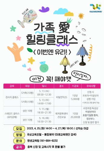 클래스 참가를 희망하는 군민은 오는 25일부터 곡성교육포털에서 과정별로 순차적으로 신청할 수 있다. 원데이클래스 프로그램 운영은 5월 13일부터 7월 8일까지 진행되며 꽃핸드타이드, 제과제빵 등 다양한 원데이클래스가 제공될 예정이다.