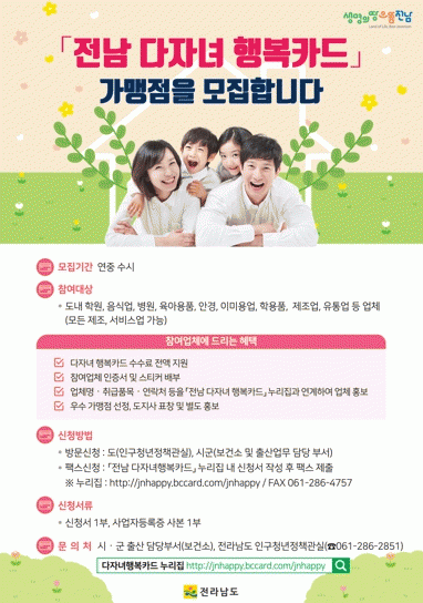 ‘전남 다자녀 행복카드’ 누리집에서 신청서를 내려받아 작성 후 사업자등록증 사본과 함께 시군 보건소에 방문 또는 팩스로 신청하면 된다.