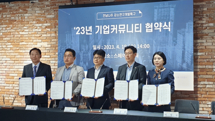 20일 나주시에 따르면 전남나주 강소특구사업단은 지난 19일 빛가람동 스페이스코웍에서 전라남도와 나주시, 한전, 강소특구기업 30곳이 참여한 ‘전남나주 강소연구특구 기업 커뮤니티 협약’을 체결했다.