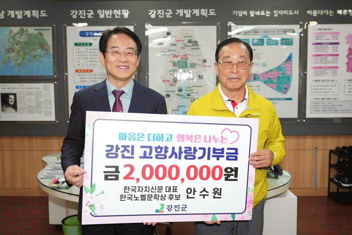 강진군은 한국자치신문의 대표이자 노벨문학상 후보로 선정된 안수원 회장이 고향사랑기부금 200만 원을 기탁했다고 20일 밝혔다.