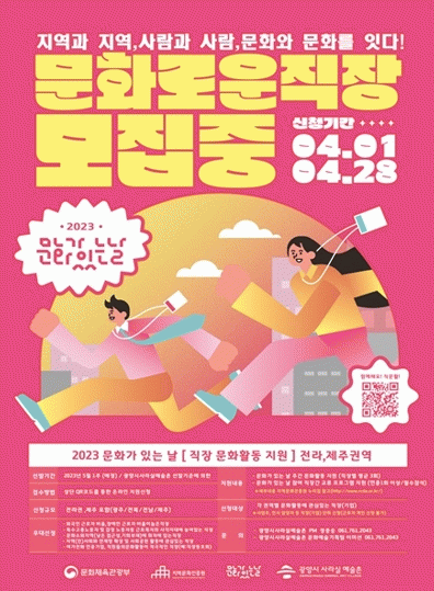 [뉴스맘]광양시 사라실예술촌은 오는 28일까지 2023년 문화가 있는 날 '직장 문화 활동 지원사업'에 참여할 전라-제주권 참여 직장을 모집한다고 20일 밝혔다.