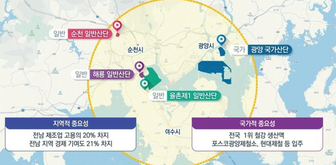주요 내용으로는 광양국가산단을 거점으로 하고 율촌제1, 해룡, 순천산단을 연계해 2026년까지 △온실가스 배출량 15% 감축 △생산 및 고용 10% 증가 △스마트공장 보급확산 등을 목표로 총 39개 사업에 6,848억원을 지원할 예정이다.