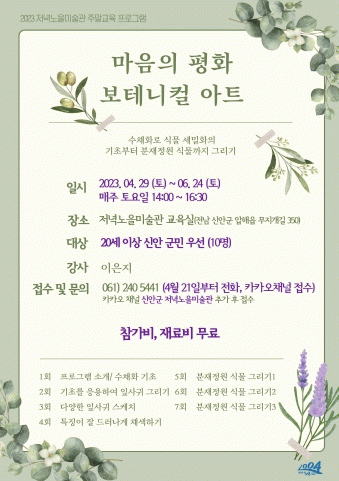 한편, 프로그램에 관심 있는 사람이라면 신안군민 누구나 신청할 수 있으며 4월 21일부터 전화 또는 신안군 저녁노을미술관 카카오 채널 검색 후 채팅을 통해서도 신청할 수 있다.