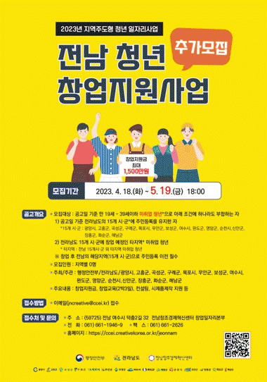 ‘전남 청년 창업지원사업’은 행정안전부 공모의 2023년 지역주도형 청년일자리사업의 일환으로 전라남도와 화순군이 공동 주관하며, (재)전남창조경제혁신센터가 사업수행을 담당한다.