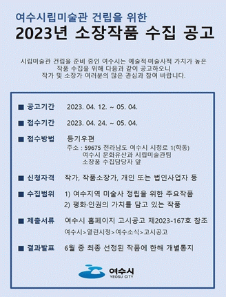 올해 수집 대상은 여수지역 미술사 정립을 위한 주요작품, 평화·인권의 가치를 담고 있는 작품 가운데 예술적·학술적 가치를 인정받는 작품이다.
