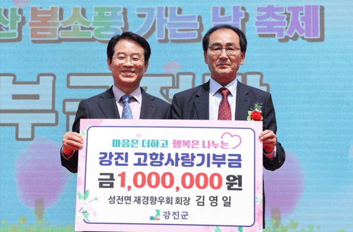강진군에 따르면 성전면 재경향우회 김영일 회장이 4월 22일 개최된 ‘강진월출산 봄소풍 가는 날 축제’ 개막식에 참여해, 고향사랑기부금 100만 원을 기탁했다고 밝혔다.