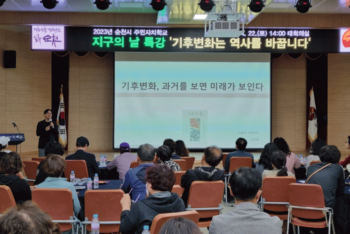 이번 주민자치학교는 제53주년 ‘지구의 날’을 기념하여, 고기후를 연구하는 박정재 교수가‘기후위기와 히스토리’라는 주제로 강연을 했다.