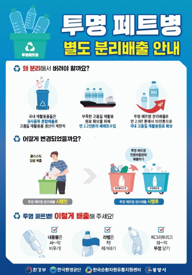 황광진 자원순환과장은 “투명페트병 분리배출의 기본은 내용물을 비우고 상표띠(라벨)는 뜯고 뚜껑은 닫는 것”이라며 “순환 경제 활성화를 위해 시민들께서 투명페트병 별도 분리배출에 적극적인 동참해 주시기 바란다”고 말했다.