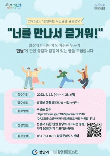 이번 시민 글귀 공모는 ‘만남’에 관한 공감과 감동을 주제로 하며, 광양시를 생활권으로 둔 시민이라면 누구나 참여할 수 있다.