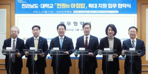 협약에 따라 전남도는 식습관 변화 등으로 결식률이 높은 대학생에게 아침 식사를 1천 원에 제공하는 ‘천원의 아침밥’ 사업에 정부 지원 외에 전남도에서 1천 원을 추가로 지원해 대학생에게 양질의 아침 식사를 제공한다.