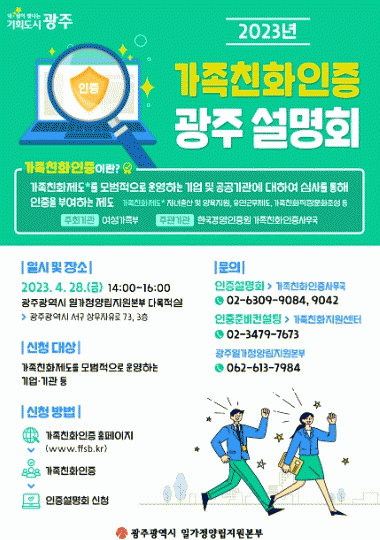 광주시는 지난해까지 총 121개 기업·기관이 여성가족부의 가족친화인증을 받았으며, 다양한 가족친화경영 활동을 통해 기업의 생산성을 높이는 데 노력하고 있다.