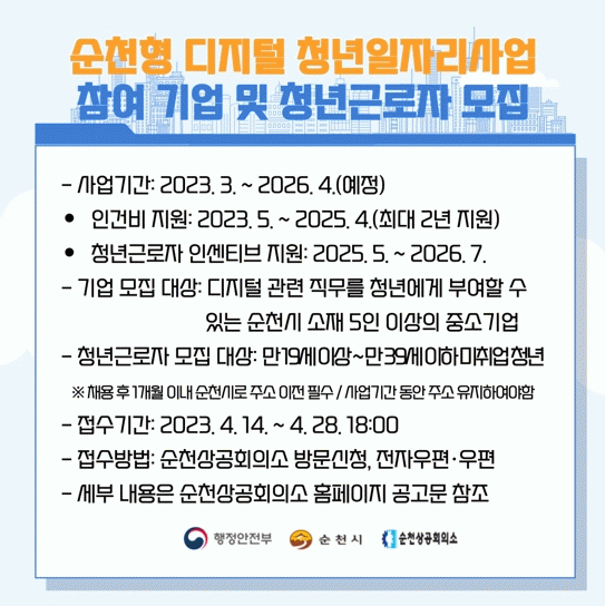 기타 자세한 내용과 신청서식은 전남일자리통합정보망, 순천시 누리집 공고문에서 확인하거나 순천시청 청년정책과 청년일자리팀으로 문의하면 된다.