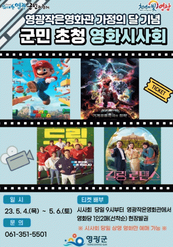 5월 4일부터 5월 6일까지 3일간은 영광군민(개인)을 위한 시사회로 영화상영 당일 오전 9시부터 영광작은영화관에서 선착순 현장 예매(영화당 1인 2매 한정)가 가능하며 상영 예정 작품으로는 ‘슈퍼 마리오 브라더스’, ‘아머드 사우르스’,‘드림’,‘킬링 로맨스’가 있다.