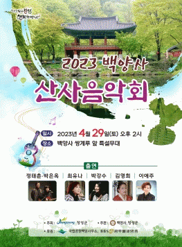 장성군 주최, 백양사 주관의 ‘백양사 산사음악회’가 29일 오후 2시부터 3시 30분까지 쌍계루 앞에 마련된 특설무대에서 펼쳐진다. 내장산국립공원 백암사무소와 비비에스(BBS) 광주방송이 후원을 맡았다.