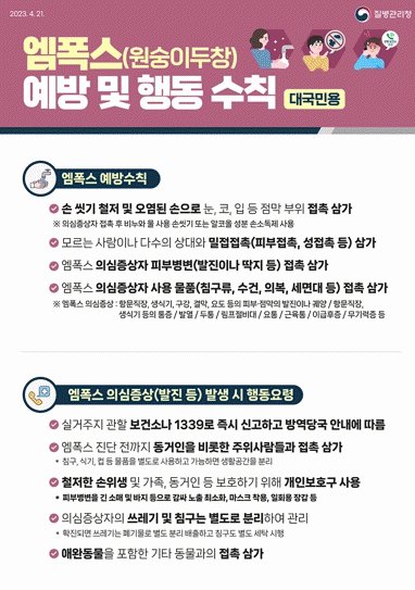 또한 의심환자 등과 접촉 후 엠폭스 감염 의심증상이 있을 경우 즉시 질병관리청 또는 거주지 보건소에 문의 후 조치사항 안내에 따라야 한다.