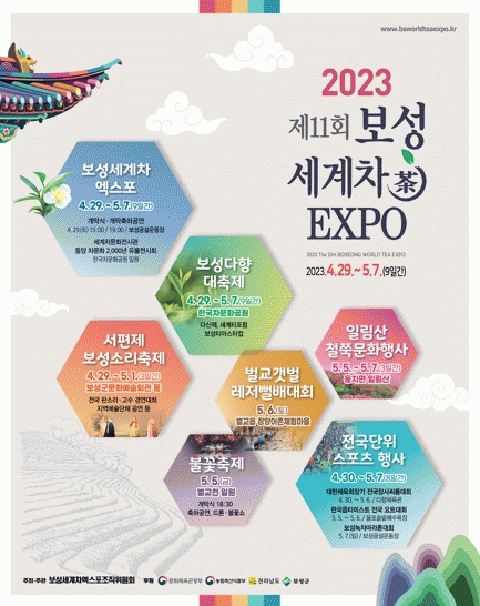 이번 행사는 보성세계차엑스포 조직위원회 주관으로 한국차문화공원, 보성읍, 벌교읍, 율포해변 등 보성군 일원에서 통합축제형 엑스포로 개최할 예정이다.
