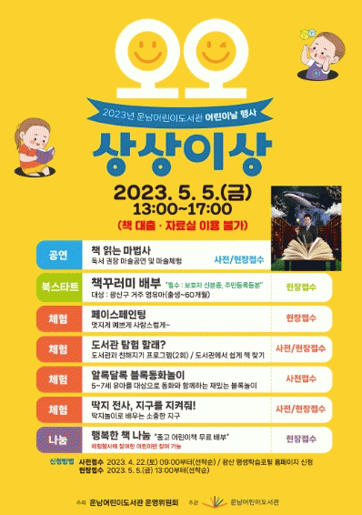 운남어린이도서관 관계자는 “도서관과 친해질 수 있는 어린이도서관만의 특색 있는 행사를 준비했다”면서 “많은 어린이가 참여해 도서관과 함께하는 행복한 추억을 남겼으면 좋겠다”고 말했다.