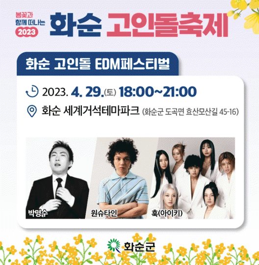 화순군 관계자는 “봄나들이하기 좋은 4월 말 잠시 여유를 찾아, 근처 고인돌 축제장을 찾아 일상의 활력을 찾길 바란다.” 며 “노랗게 물든 유채꽃과 함께 화순의 맑은 공기와 푸른 하늘을 벗삼아 많은 추억을 만들어 가셨으면 좋겠다.”고 말했다.