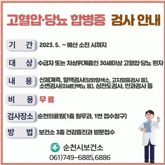 순천시보건소는 합병증 검사 지원을 위해 순천의료원과 업무협약을 체결했으며 검사를 희망하는 사람은 보건소 건강증진과(만성질환관리팀)로 방문하여 접수하면 된다.