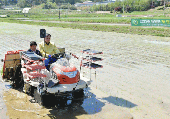 이병노 담양군수는 이날 첫 모내기 현장에 방문해 직접 이앙기로 논에 모를 내는 등 일손을 도왔으며, 농가의 애로사항을 청취하고 격려했다.