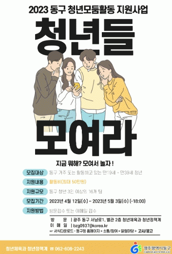 모집 대상은 관내 거주하거나 직장에 다니는 만 19~39세 청년, 3명 이상으로 구성된 모둠(동아리·모임·단체)이다. 참여를 희망하는 청년들은 동구청 방문 또는 이메일로 접수하면 된다.