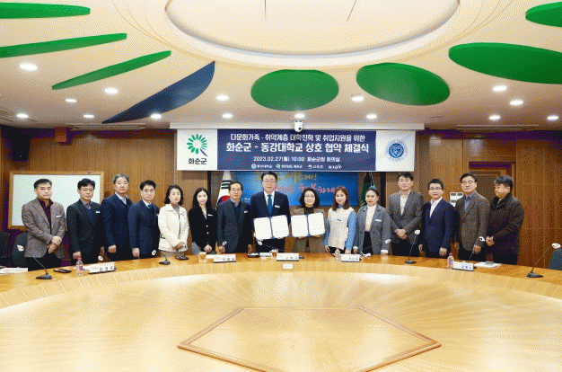 한편 화순군은 지난 2월 27일 다문화가족 · 취약계층 대학진학 및 취업지원을 위한 화순군 - 동강대학교 간 상호 협약식을 체결했다.