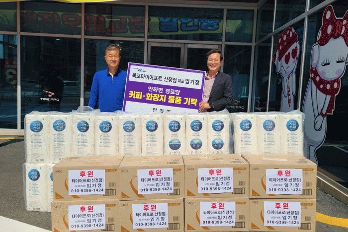 이러한 소식들이 전해지면서 목포 타이어프로 산정점 대표 임기정은 200만원 상당의 커피, 화장지를 42개 경로당에 기부하는 등 선행을 이어가고 있어 안좌면 지역사회에 따뜻한 고향사랑 바람이 불고 있다.