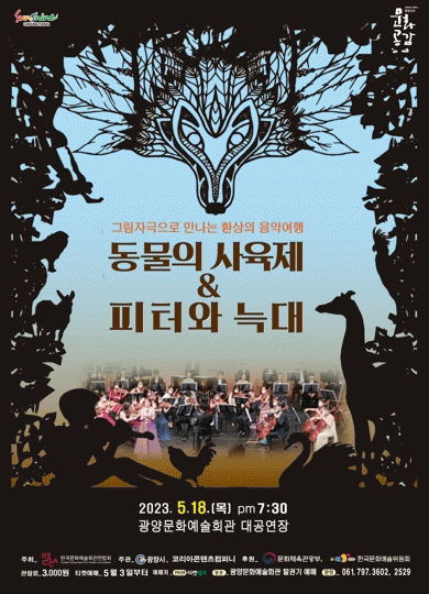 러시아 작곡가 프로코피예프의 ‘피터와 늑대’는 집 나간 오리를 찾아 숲속에 들어간 피터가 무서운 늑대를 만나 위험한 상황에 빠지는 난관을 용기와 재치로 극복하고 더욱 성장해서 돌아온다는 내용으로, 극적 긴장과 등장인물의 특징에 최적화된 관현악 연주가 아이들과 관람객의 창의적 감수성을 한껏 높여줄 것이다.