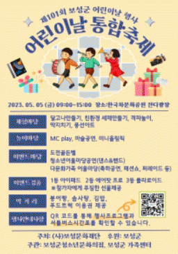 김철우 보성군수는 “아이들은 오늘의 주인공이자 미래의 희망이다.”라며 “코로나19로 인해 4년 만에 개최하는 어린이날 축제인 만큼 꿈과 희망이 가득한 즐거운 놀이의 장이 됐으면 한다.”라고 말했다.