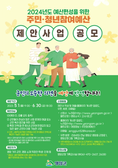 영암군은 이번 공모와 더불어 이달부터 ‘찾아가는 주민·청년참여예산학교’를 실시한다.