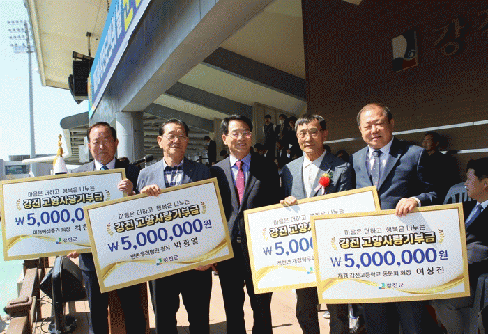 강진군에 따르면, 1일 ‘제51회 군민 화합 한마당 행사’에서 미래에셋증권 최현만 대표, 평촌우리병원 박광열 원장, 작천면 재경향우회 이경수 회장, 재경 강진고등학교 동문회 여상진 회장이 고향사랑기부제 최고 금액인 500만 원을 각각 기탁했다고 밝혔다.