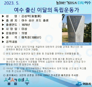 시 관계자는 “조국을 위해 희생하신 독립운동가들 덕분에 지금의 대한민국, 지금의 여수가 있다”며 “우리 지역 독립운동가를 잊지않고 기억할 수 있도록 독립운동가 홍보에 더욱 힘쓰겠다”고 밝혔다.