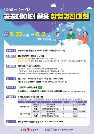 참가 희망자는 광주시와 광주창조경제혁신센터 홈페이지, 광주시 빅데이터 통합플랫폼에 게시된 공고를 참고해 5월 22일부터 6월 2일까지 전자우편(이메일)으로만 신청할 수 있다. 서류 및 발표 평가를 거쳐 6월 28일 광주광역시장상 등 6개의 우수작을 선정하고, 총상금 1600만원을 수여할 예정이다.