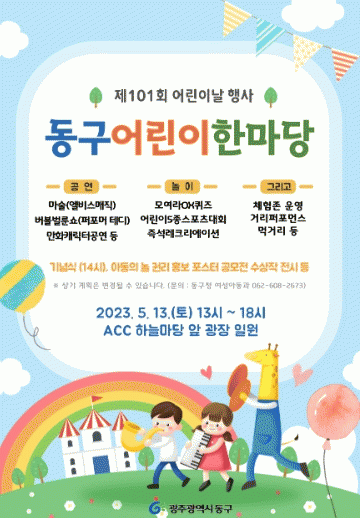 임택 동구청장은 “5월 가정의 달을 맞아 어린이와 부모가 함께 즐길 수 있는 다양한 체험행사를 준비했다”면서 “행사장에는 지난 3월 추진한 ‘아동 놀 권리 포스터 공모’ 수상작 전시회도 마련해 아이들의 생각이 담긴 포스터를 보며 아동 권리를 이해하고 실천할 수 있는 계기가 되기를 바란다”고 말했다.