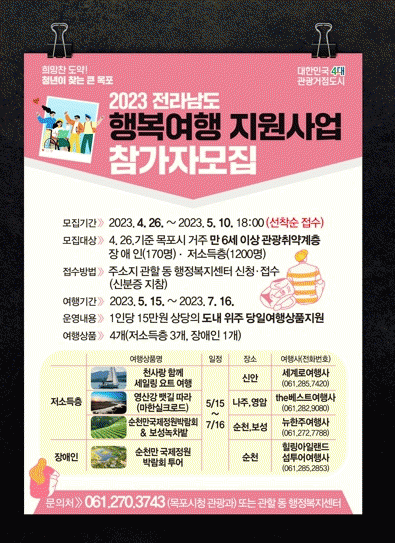 시 관계자는 “이번 사업을 통해 관광 활동에서 소외된 취약계층이 부담없이 여행을 즐기는 기회가 될 것이다”면서 “지역 내 관광산업이 활성화하는 계기가 될 것으로 기대한다”고 참여를 적극 권장했다.