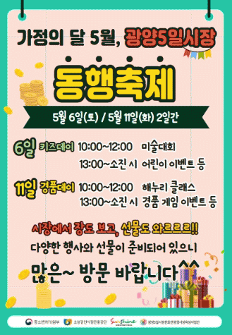 광양5일시장은 장날인 6일에 어린이날을 맞이하여 미술대회와 어린이날 행사를 개최하고, 11일에는 키즈 클래스와 ‘시장에서 장보고, 선물도 와르르’ 경품 게임 이벤트가 진행된다.