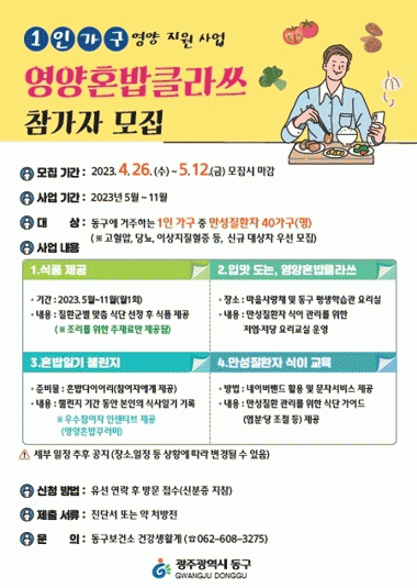 모집 기간은 오는 12일까지로 동구 거주 1인 가구 중 만성질환이 있는 주민 대상이다. 프로그램 참여를 희망하는 1인 가구는 보건사업과 건강생활계로 연락 후 안내에 따라 신청하면 된다.