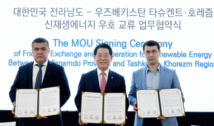 주요 협약 내용은 ▲두 나라 지방정부 간 태양광.풍력 등 에너지정책 공유 ▲전남 에너지기업의 우즈베키스탄 시장 진출 ▲두 나라 에너지기업 및 연구기관 간 기술교류와 인력 양성 확대 등이다.