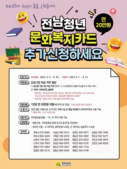 ‘강진군 전남청년 문화복지카드 지원사업’은 청년의 문화생활 향유 및 자기개발 기회를 제공하기 위해 전남도와 함께 관내 청년들에게 연 20만 원의 문화 복지비용을 지원하는 사업이다.