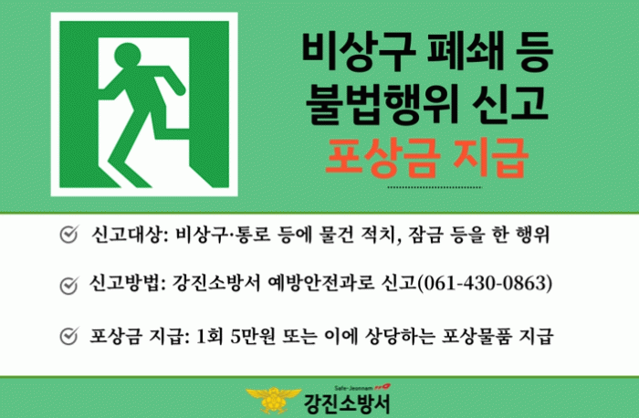 강진소방서 관계자는 “화재 발생 시 비상구는 생명을 살리는 탈출로이다”라며 “소방시설과 비상구 등에 대한 불법행위 신고포상제에 대하여 시민 여러분의 많은 관심과 참여를 부탁한다”고 말했다.