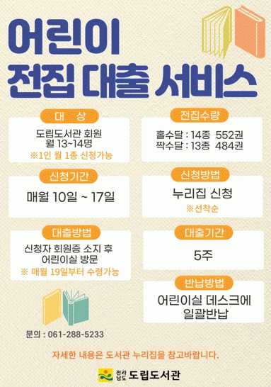 ‘어린이 전집 대출 서비스’는 전남도립도서관 누리집을 통해 신청하면 된다. 매월 10일부터 도립도서관 회원을 대상으로 신청받는다. 13~14명을 선착순으로 선정해 19일부터 전집을 대여하며 5주 동안 이용할 수 있다.