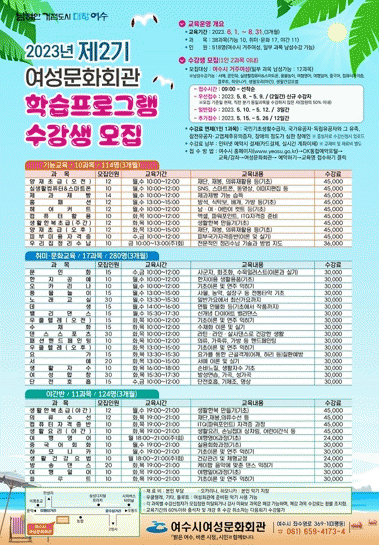 희망자는 여수시 홈페이지 ‘OK통합예약시스템’ 교육/강좌에서 여성문화회관 교육을 신청하면 된다.