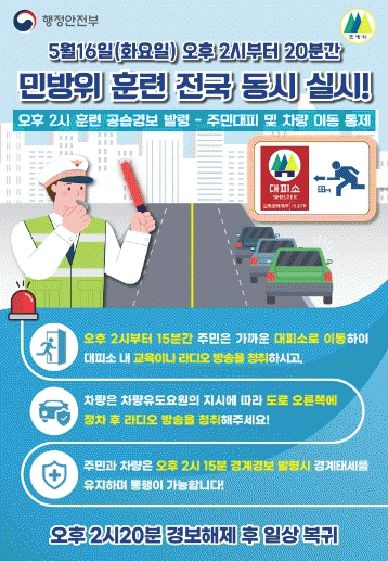 이번 훈련은 2017년 이후 6년 만에 실시하는 것으로 지하 주차장 등 가까운 민방위 대피시설로 피하는 대피훈련과 비상시 국민행동요령, 방독면 착용법, 심폐소생술 등을 익히는 훈련으로 이뤄진다.
