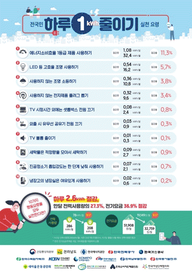 ‘하루 1kWh 줄이기’는 ▲사용하지 않는 조명을 끄고 플러그 뽑기(0.6kWh/일) ▲발광다이오드(LED) 등 고효율 조명 사용(0.5kWh/일) ▲냉장고 냉장실 20% 비우기(0.1kWh/일) ▲에너지 효율 1등급 제품 사용(1.1kWh/일) 등을 통해 실천할 수 있다.
