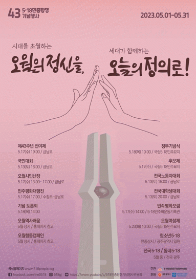 이어 18일 오전 10시에는 국립5·18민주묘지에서 ‘제43주년 5?18민주화운동 국가기념식’이 거행된다. 기념식은 5·18민주유공자와 유족, 각계 대표 등이 참석한 가운데 헌화·분향, 경과보고, 임을위한행진곡 제창 등 순서로 펼쳐진다.