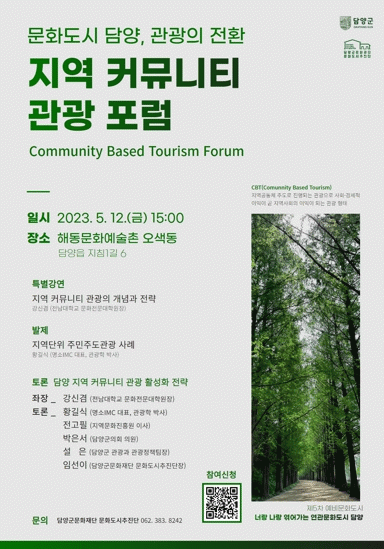 전남대학교 문화전문대학원장 강신겸 교수의 ‘지역 커뮤니티 관광의 개념과 전략’을 주제로 하는 특별강연을 필두로 명소IMC 황길식 대표의 ‘지역단위 주민주도관광 사례’ 발제에 이어, 담양군의회, 행정, 관광 분야 기획자 등 지역의 각 분야 전문가의 자유 토론 형식으로 진행된다.
