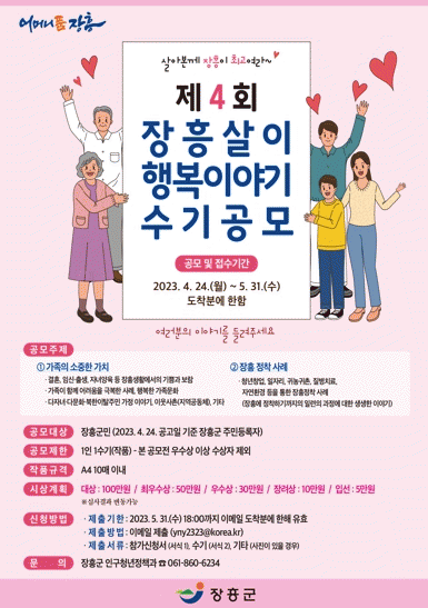 공모전 주제는 장흥살이의 행복한 이야기와 결혼, 자녀양육 등 가족의 소중한 가치, 귀농·귀촌, 자연환경 등 다양한 정착사례 등이다.