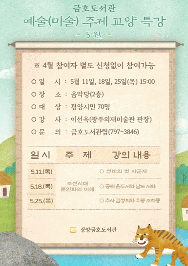 [뉴스맘]광양금호도서관이 오는 11일 오후 3시, 금호도서관 음악당에서 예술(미술) 특강의 5월 명사로 광주의재미술관 이선옥 관장을 초청해 ‘조선시대 문인화의 이해’를 주제로 강연을 연다.